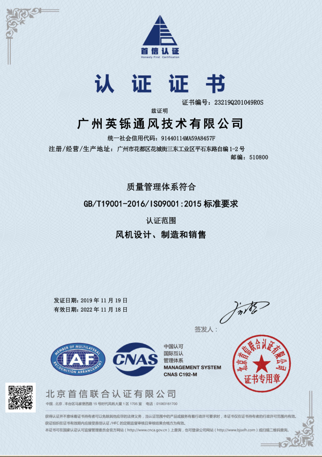 英铄通风最新ISO9001证书